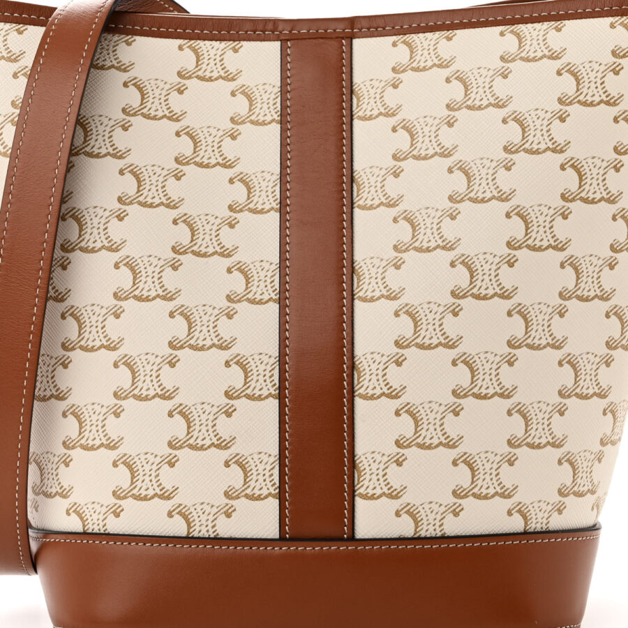This is an authentic CELINE Triomphe Canvas Calfskin Small Bucket Bag in White. This ultra-chic shoulder bag is crafted of white Triomphe monogram coated canvas with brown leather trim. The bag features an adjustable leather shoulder strap with gold hardware and a snap closure. The top opens to a brown fabric interior.