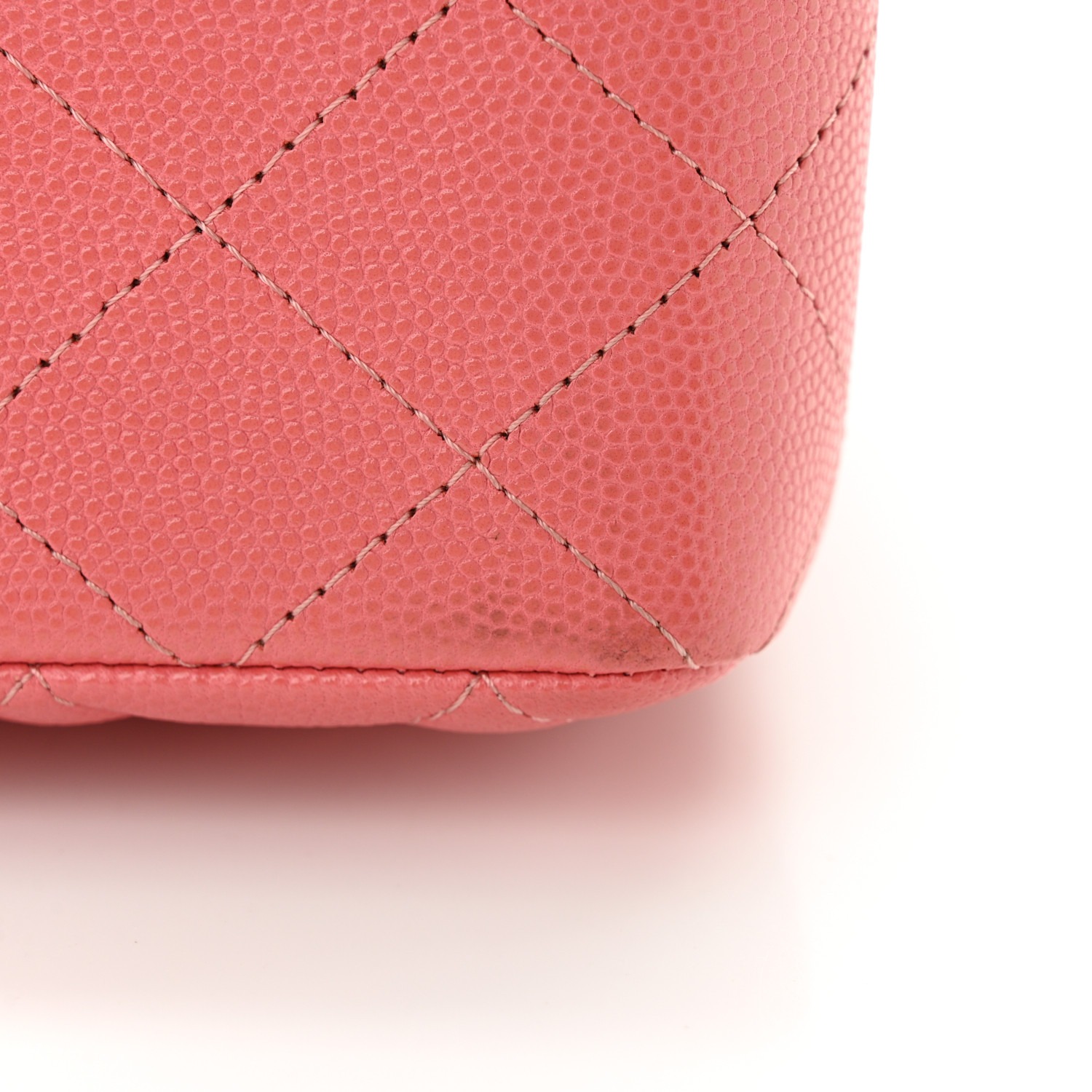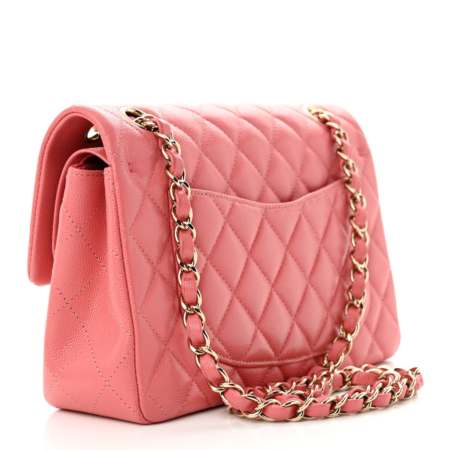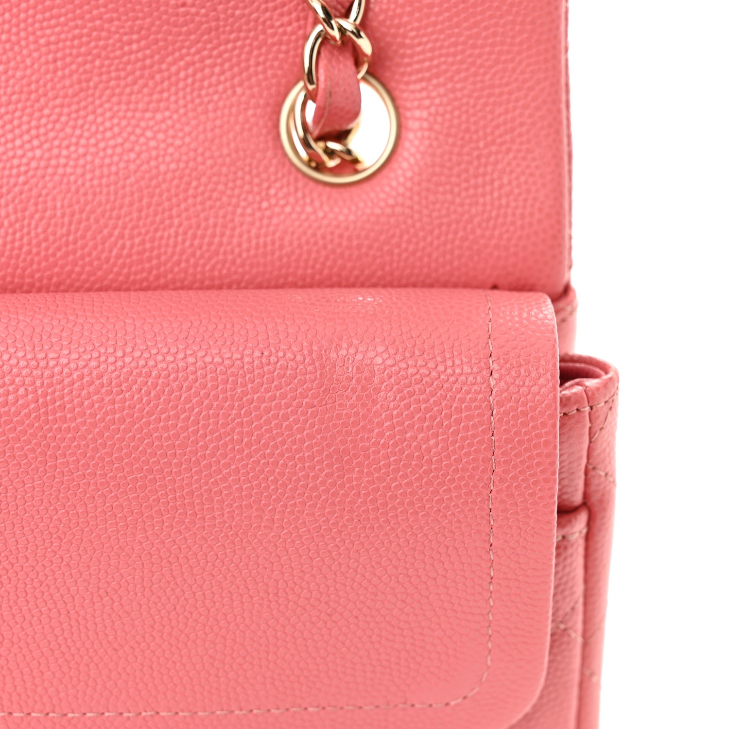 This is an authentic CHANEL Caviar Quilted Small Double Flap in Pink. This shoulder bag is crafted of luxurious diamond-quilted caviar leather in pink. The bag features a rear patch pocket, a leather-threaded polished gold chain link shoulder strap, and a matching gold classic CC turn lock on the crossover flap. This opens the bag to reveal an inner flap, and a smooth leather interior with pockets.
