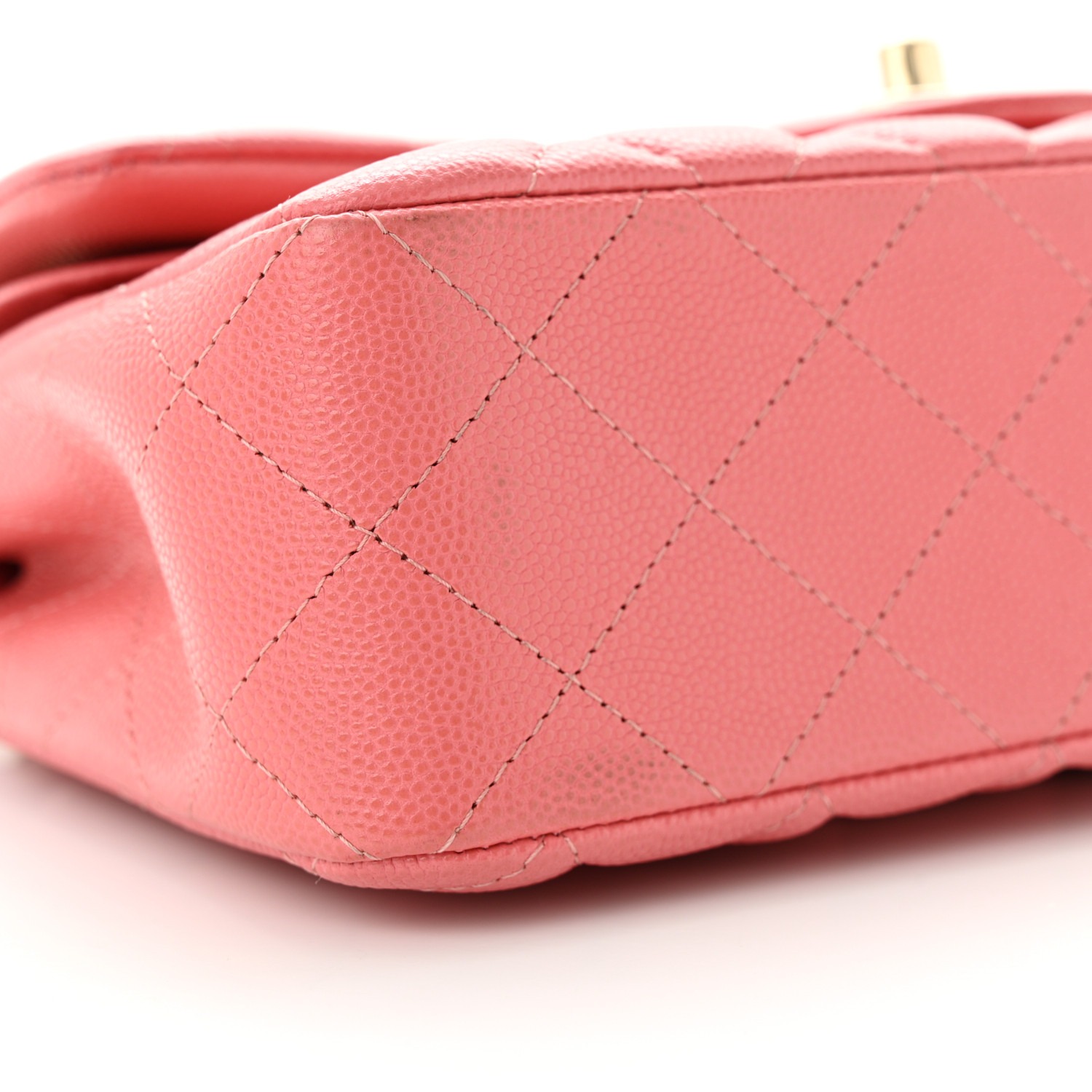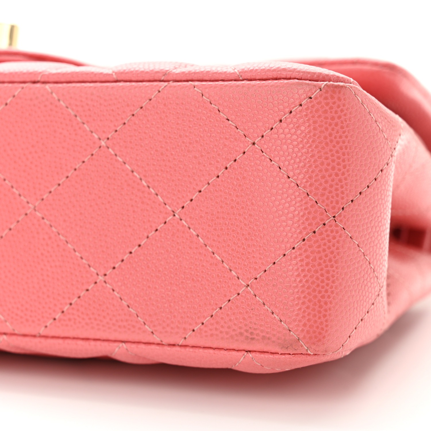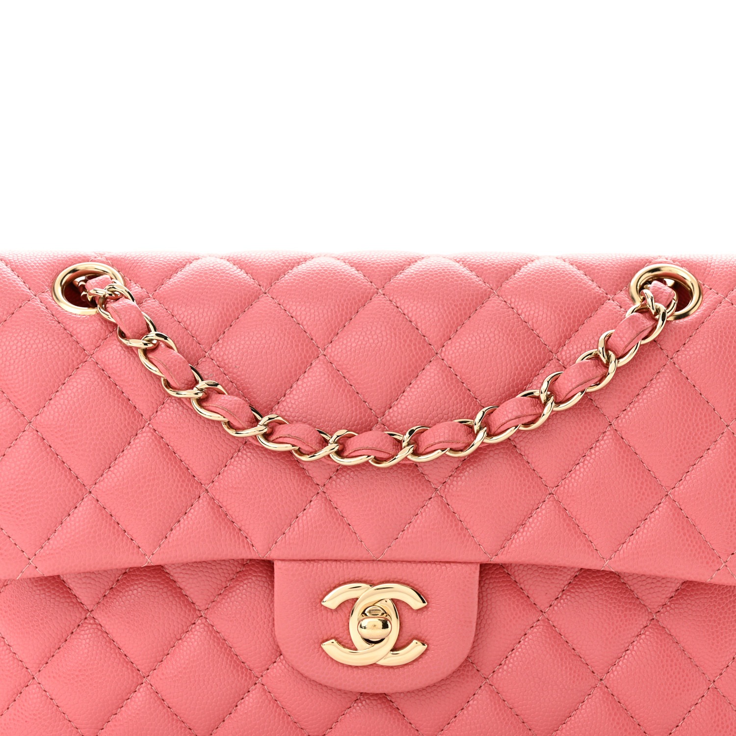 This is an authentic CHANEL Caviar Quilted Small Double Flap in Pink. This shoulder bag is crafted of luxurious diamond-quilted caviar leather in pink. The bag features a rear patch pocket, a leather-threaded polished gold chain link shoulder strap, and a matching gold classic CC turn lock on the crossover flap. This opens the bag to reveal an inner flap, and a smooth leather interior with pockets.