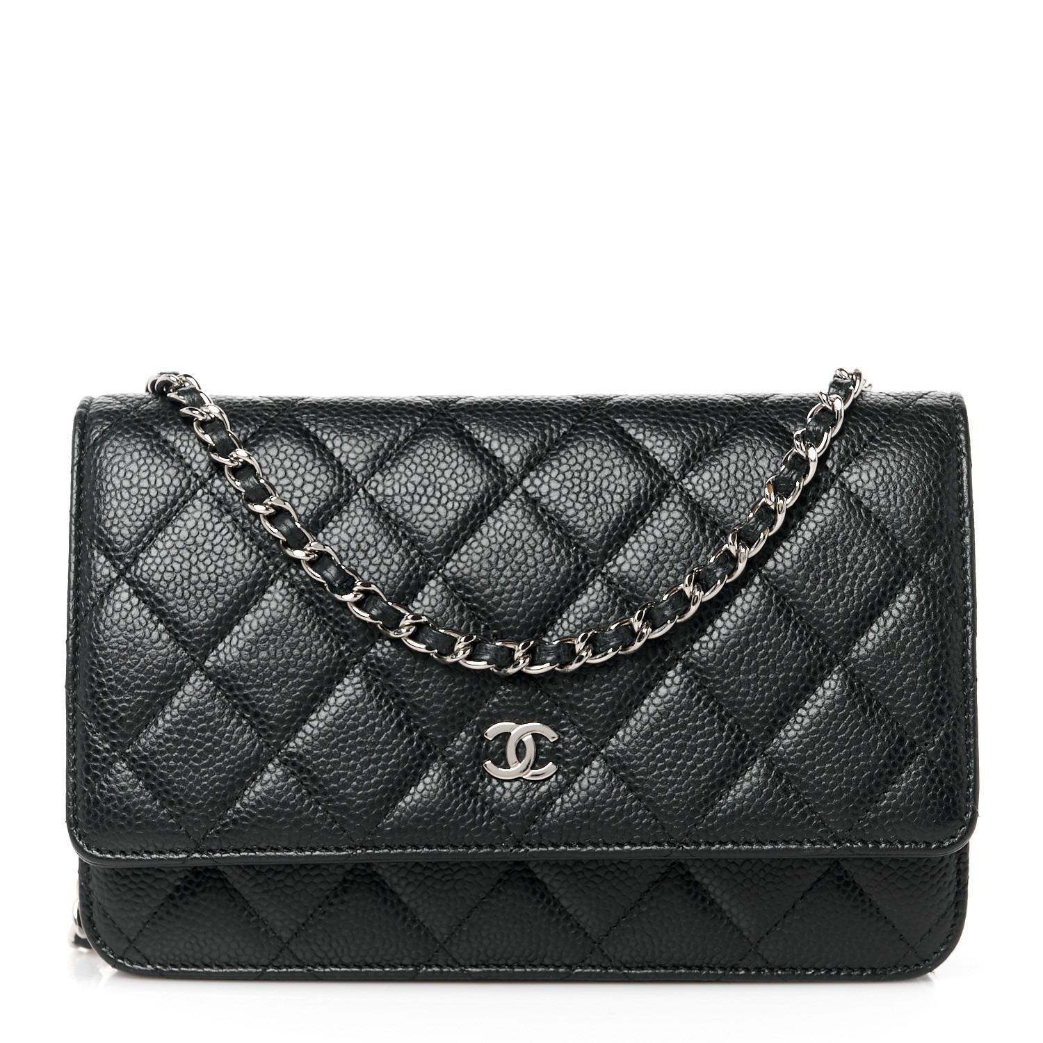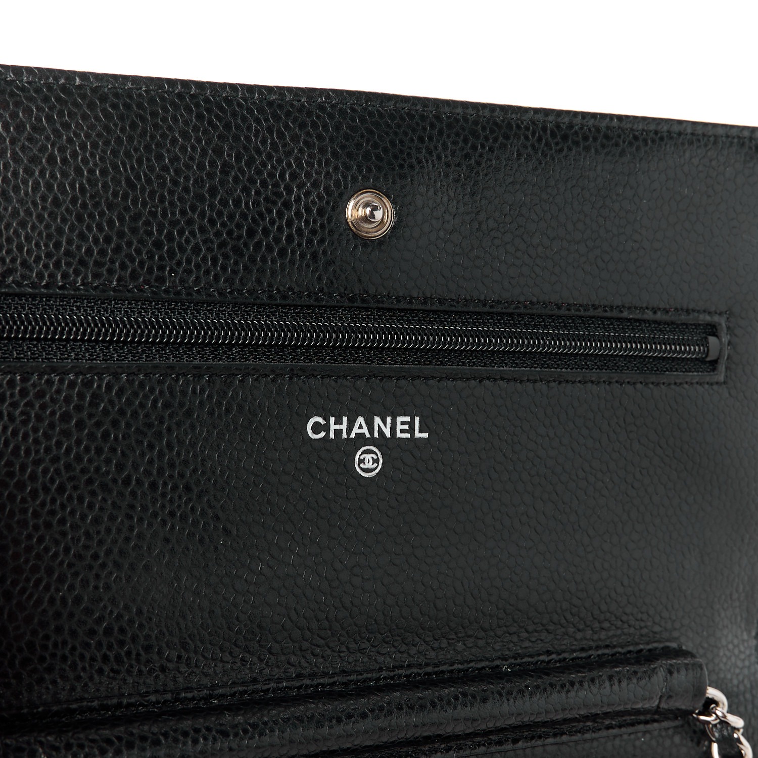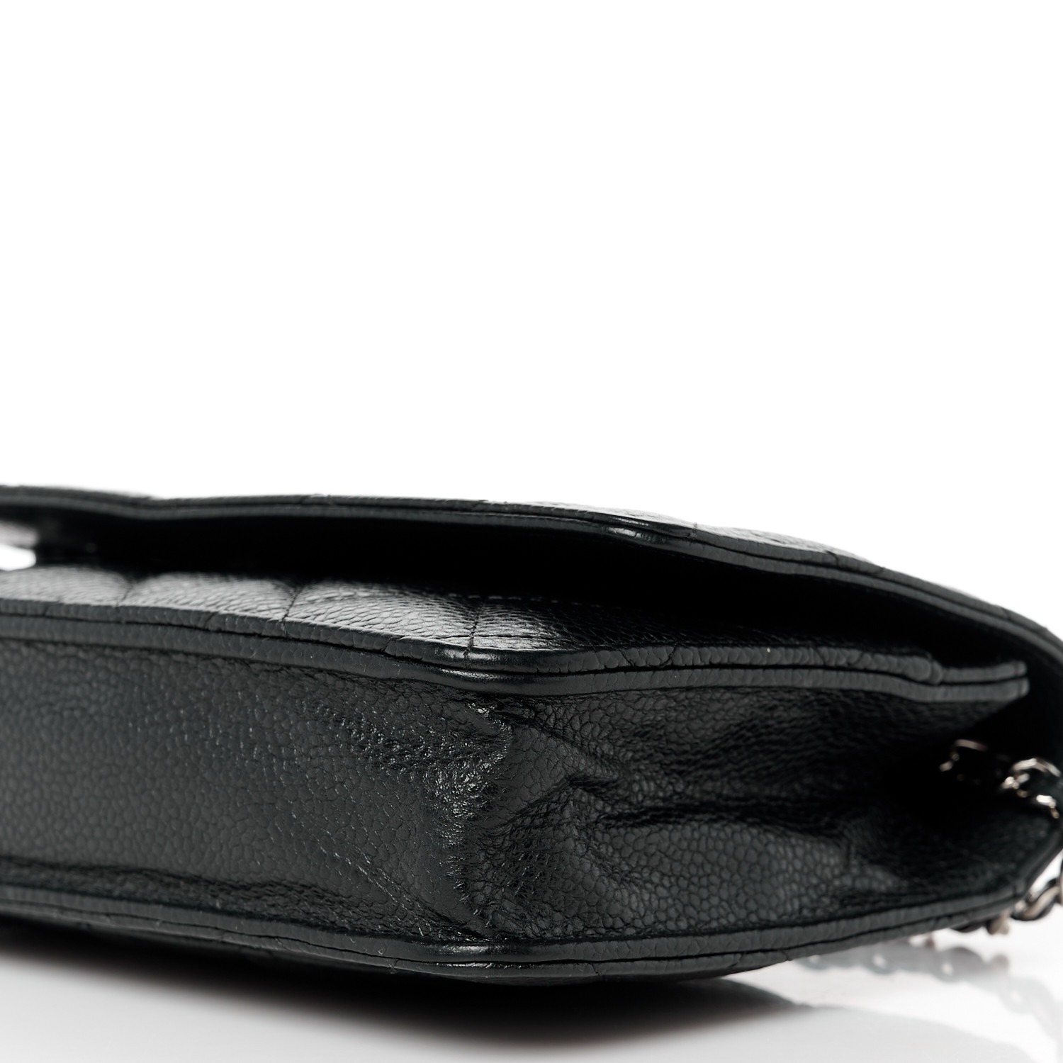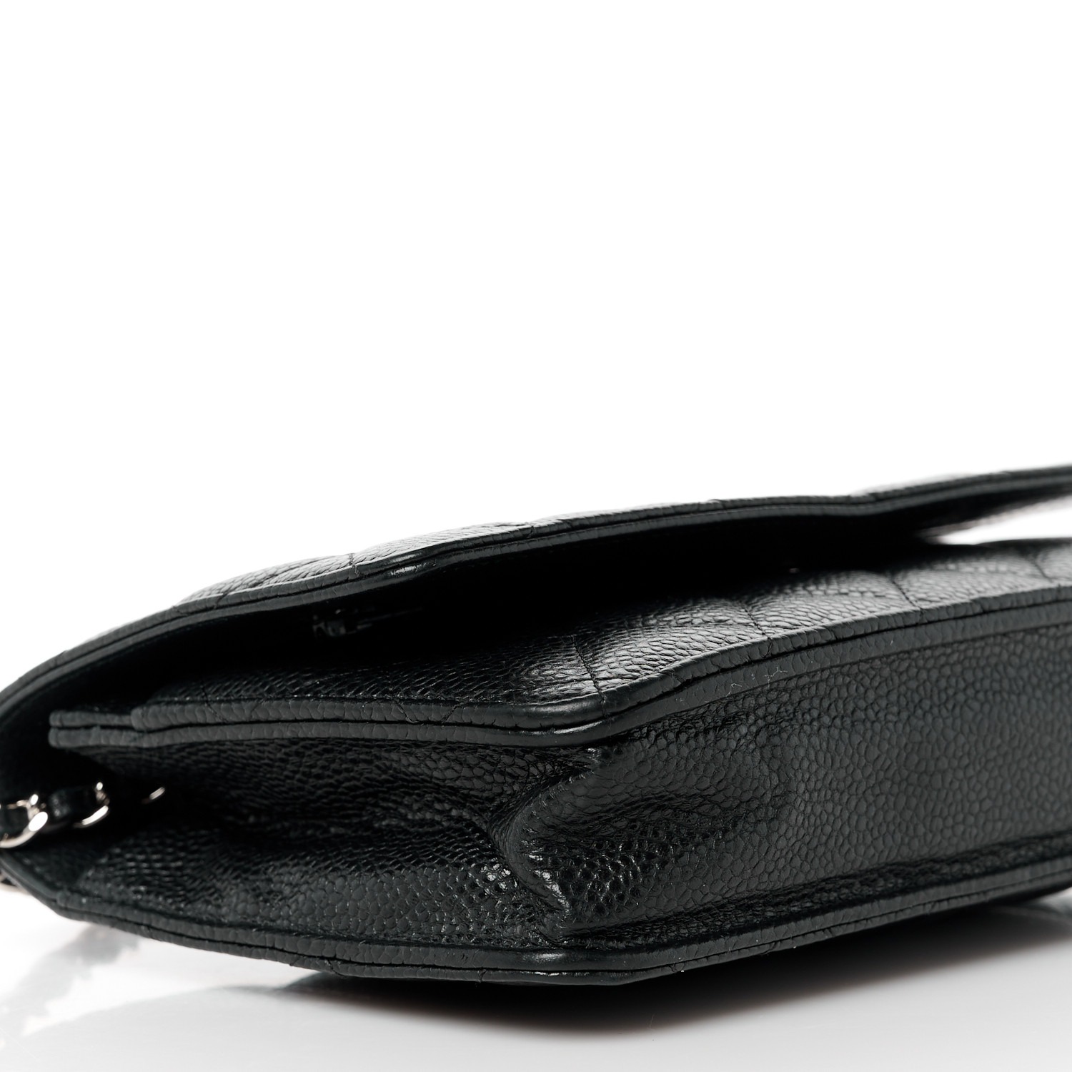 This is an authentic CHANEL Caviar Quilted Wallet on Chain WOC in Black. This stylish wallet is crafted of luxuriously textured diamond quilted caviar leather in black. This shoulder bag features a polished gold chain-link crossbody strap and a Chanel CC logo on the facing flap. The bag opens to a burgundy fabric interior with a zipper compartment, card slots, and a leather patch pocket.