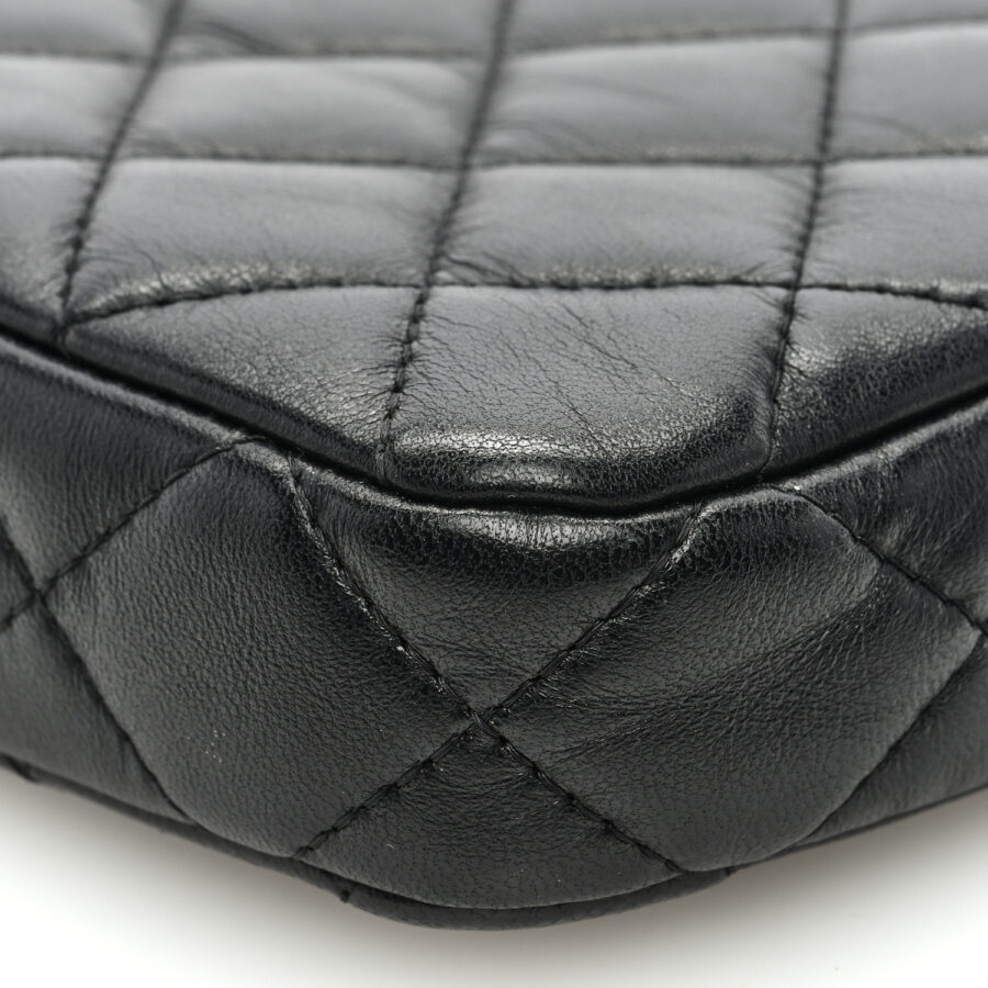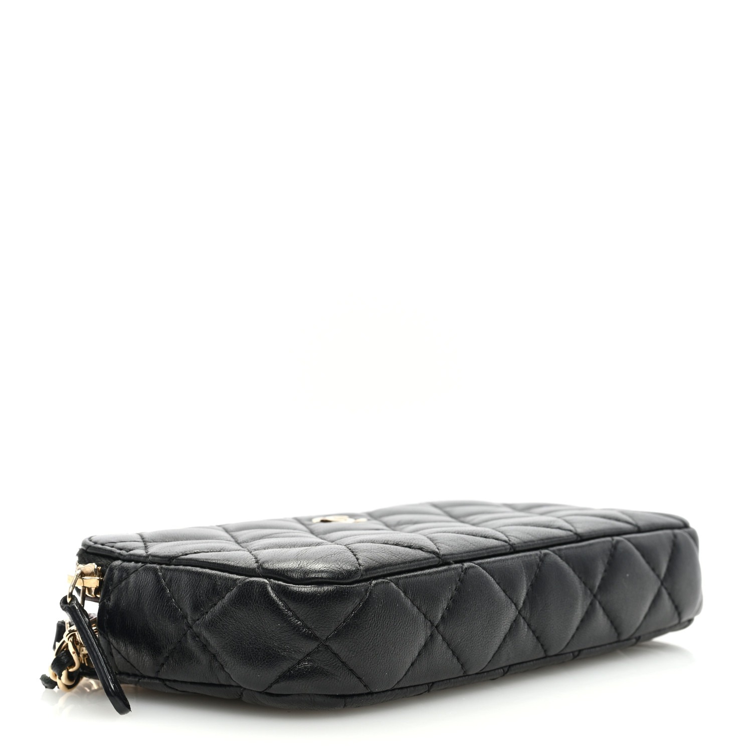 This is an authentic CHANEL Lambskin Quilted Small Clutch With Chain in Black. This stylish wallet is crafted of textured diamond quilted lambskin leather in black. The bag features a removable black leather threaded gold chain-link crossbody strap and a gold Chanel CC logo. This bag has two top zippers that open to a burgundy fabric interior with card slot panels.