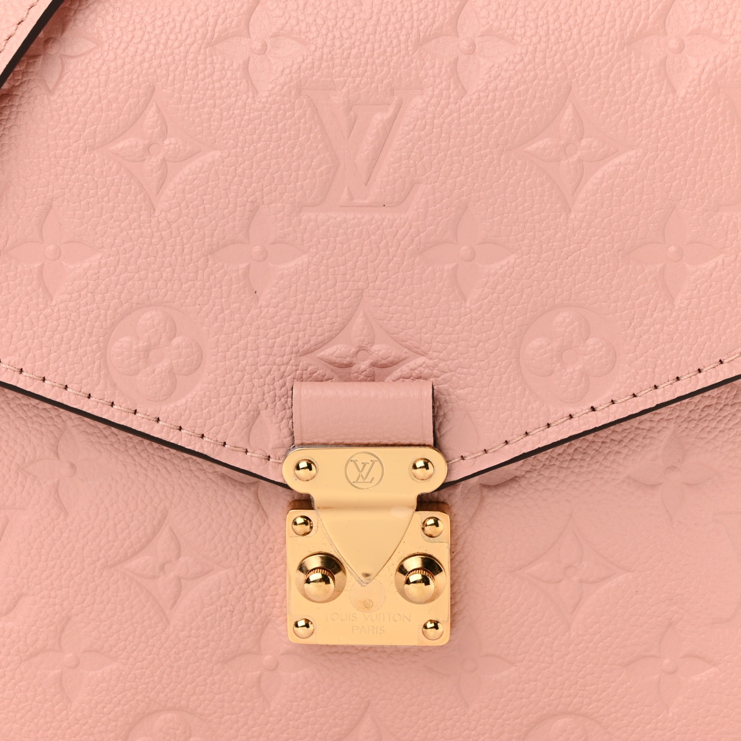 This is an authentic LOUIS VUITTON Empreinte Pochette Metis in Rose Poudre. This handbag is crafted of Louis Vuitton monogram calfskin pink leather. The shoulder bag features a pink leather top handle, an optional adjustable pink leather shoulder strap, a rear exterior zipper pocket, and a V-shaped front flap with a polished brass S-lock. The flap opens to a partitioned pink and black striped fabric interior.