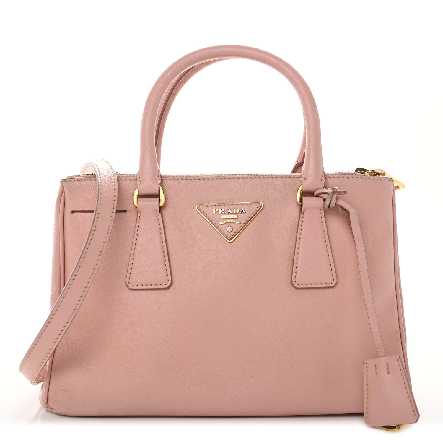 This is an authentic PRADA Saffiano Small Galleria Double Zip Tote in Orchidea. This chic tote is crafted of light pink cross-grain Saffiano leather and features rolled leather top handles with polished brass links, an optional shoulder strap with brass claps. The top features two side full-width zippered compartments and is open to a Prada monogram fabric interior with zipper and patch pockets.